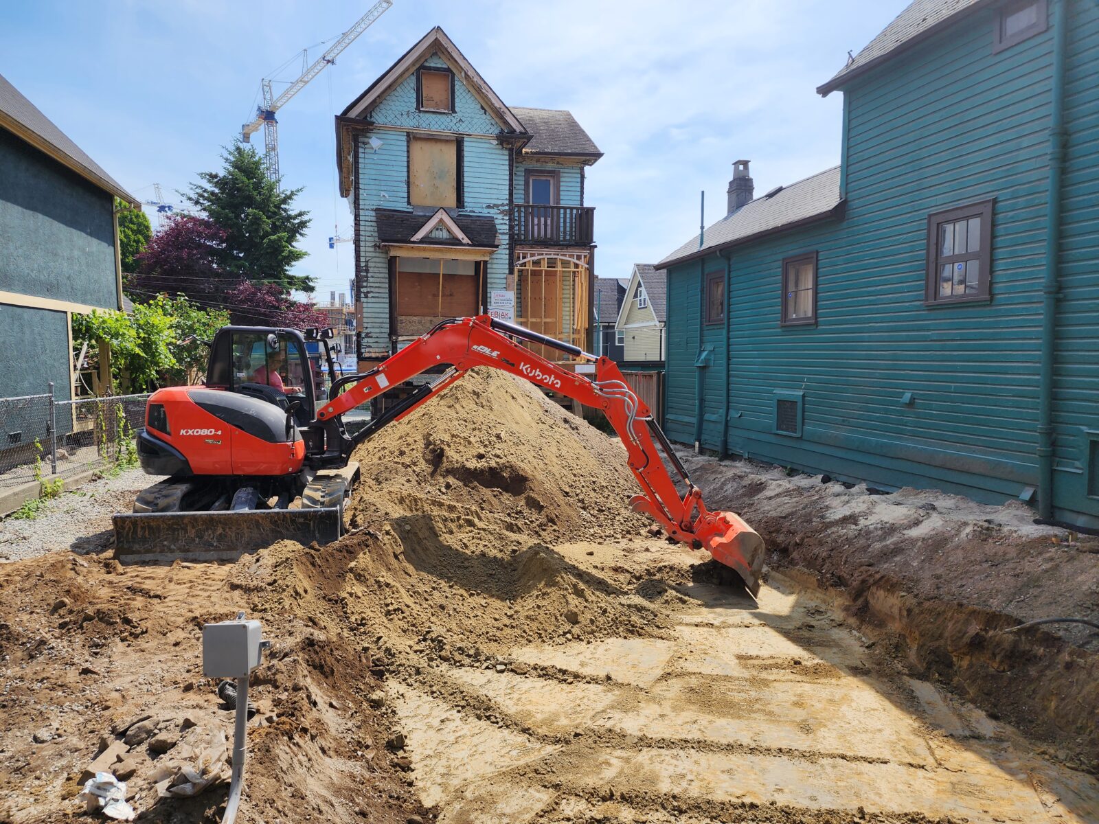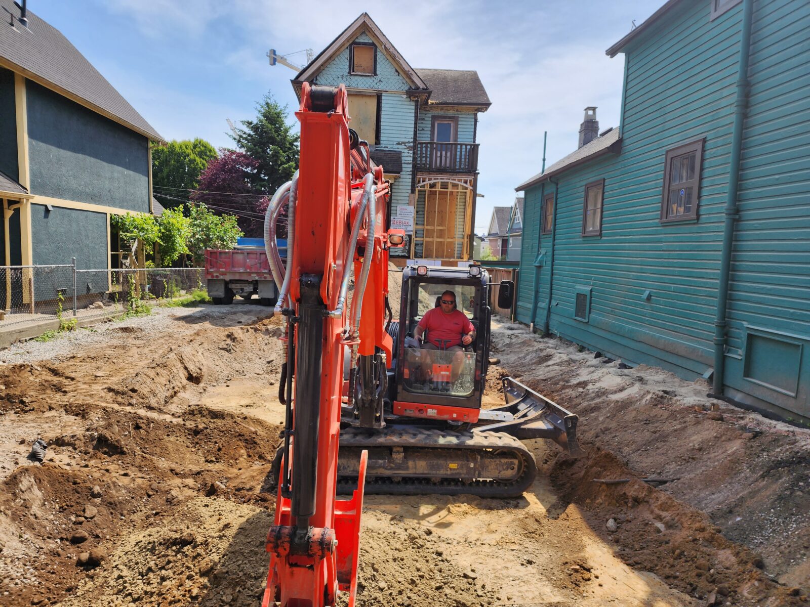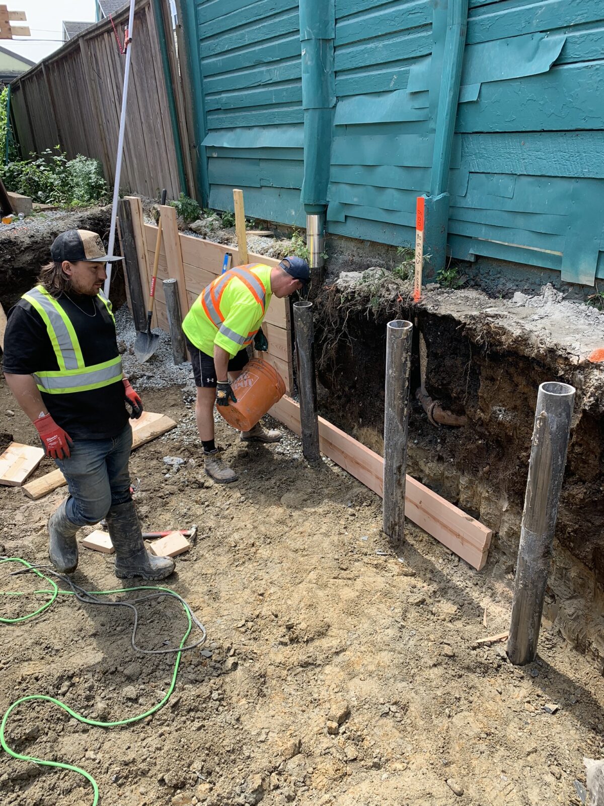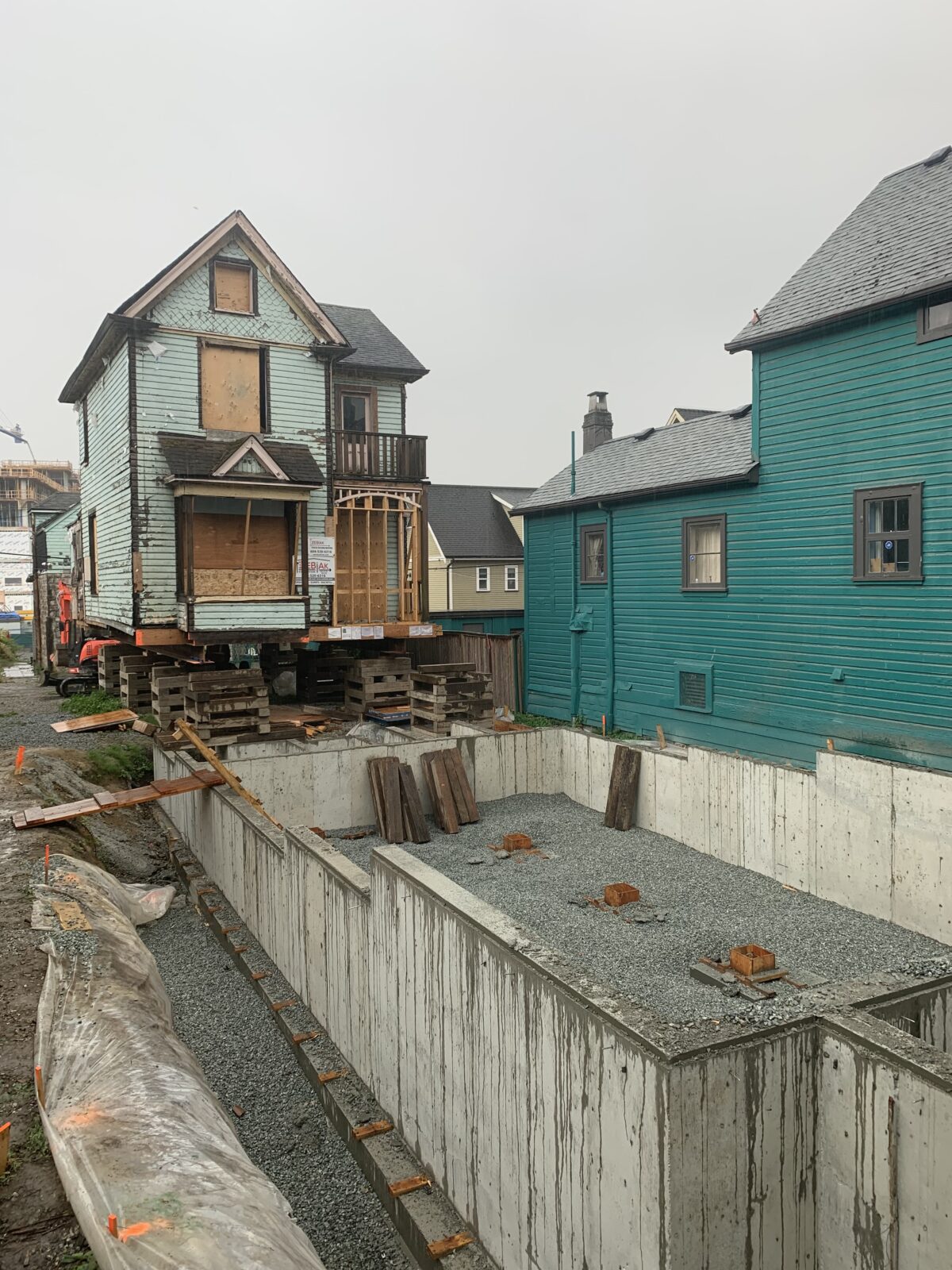 Zebiak supplied a full range of services and expertise to make this Strathcona, Vancouver MCD retention project a great success! The original scope of work was to underpin the existing foundation, which avoided having to excavate adjacent to the neighbouring house on the PL. This process would have been slow with multiple concrete pours and a lot of hand digging. Further, it would have resulted in an inferior final product: a 100 year old foundation with many cold joints from the underpin and inferior exterior damp proofing and perimeter drainage. Zebiak was able to propose a better solution. We lifted and moved the house out of the way to the rear of the lot. Then installed 4.5” pipe soldier piles and wood lagging to support the West excavation cut and neighbouring house. This allowed for the construction of a brand new and reinforced foundation with new dampproof and dimple membrane and all new perimeter drainage. This old house now sits on a solid foundation and should easily last 100 more years. As a bonus, we cut the schedule timeline in half for this scope of work, while finishing with a far superior foundation.
