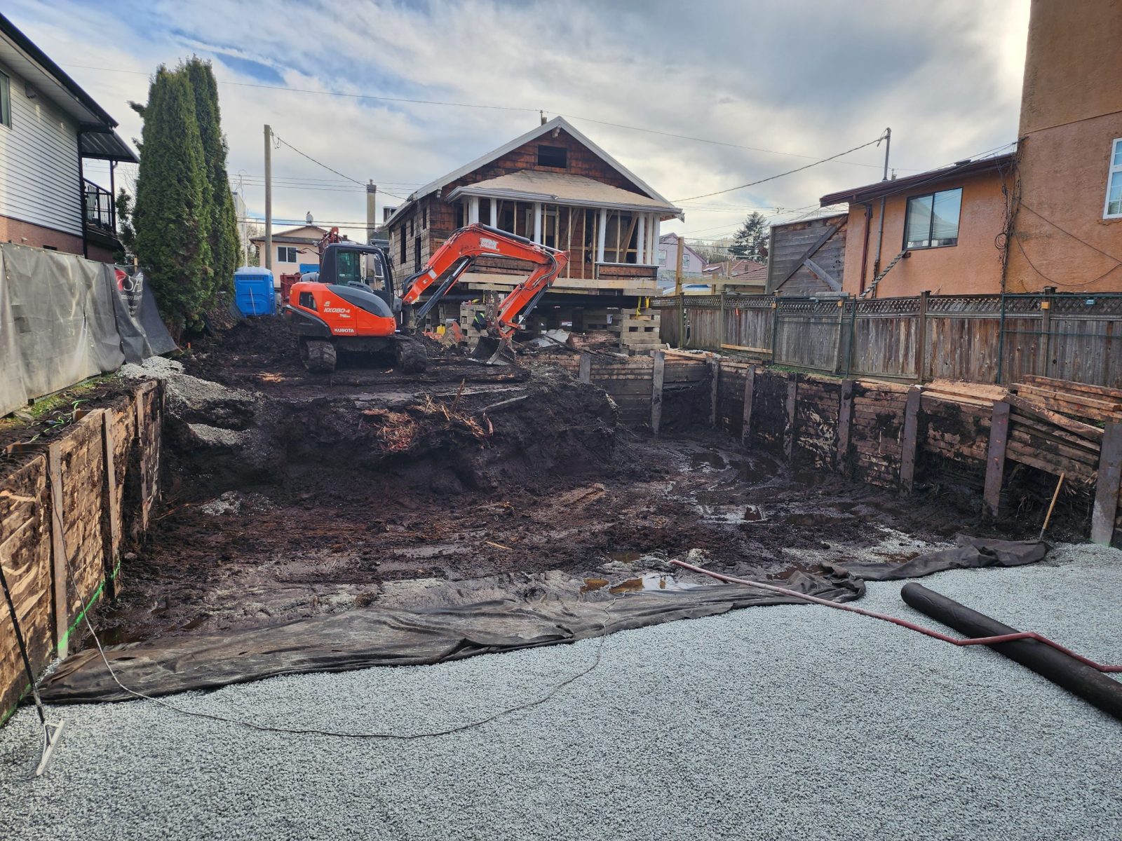Zebiak supplied a full range of services on this East Vancouver MCD retention project. Our friends at Saint Construction took on the task of turning an old single-family home into a development with 4 units. This project is located in a peat area of Vancouver; the ground is moist, organic, spongy and soft. True compact bearing soil is not located until a depth of about 35 feet. It would be cost prohibitive to excavate so deep for foundations to sit on, thus helical piles were selected to support the new foundations. But before the piles could be installed, Zebiak had to carefully excavate the footprint of the basement for the main house. The ground is so soft that getting a machines badly stuck is a real possibility. Relying heavily on our experienced leadership, our operations made tactical use of swamp pads and a dig your way out approach to ensure this excavation ran smoothly and on schedule. Upon completion we laid a base of geotextile upon the peat and installed a 16 inch base layer of clear crush gravel. This set the stage for our next phase helical pile install and foundation construction.
